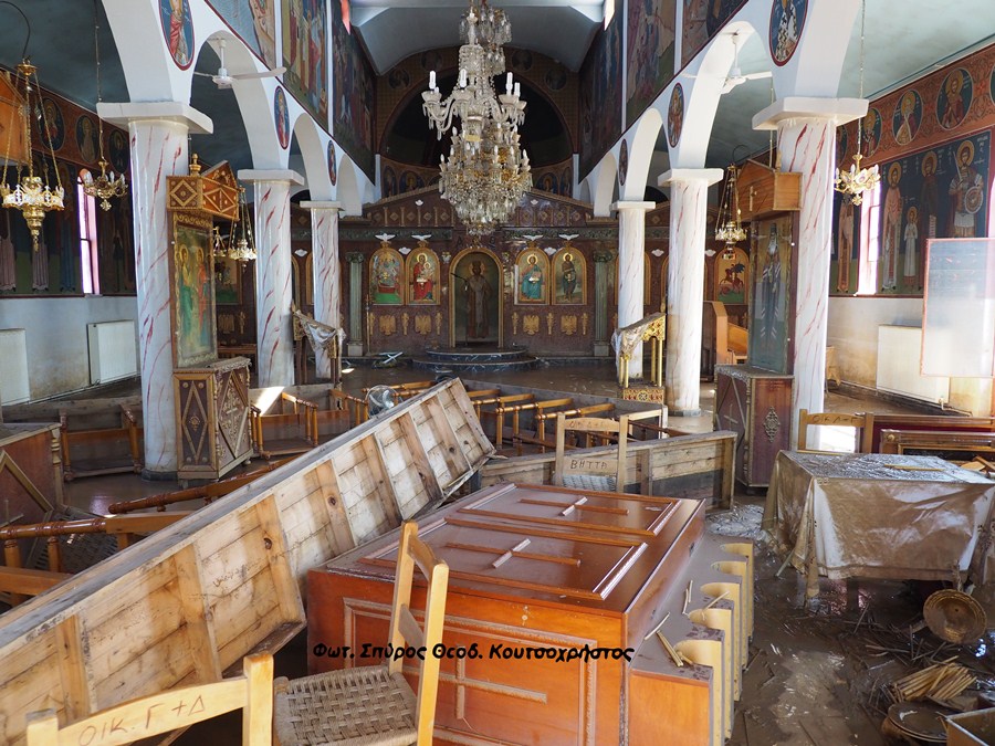 Στον Ιερό Ναό Κοιμήσεως Θεοτόκου, τα στασίδια αφού πλήθηκαν πρόχειρα με νερό, τοποθετήθηκαν ξανά στην θέση τους, για να μην φαίνεται άδεια η εκκλησία, αλλά δεν είναι πλέον χρηστικά!