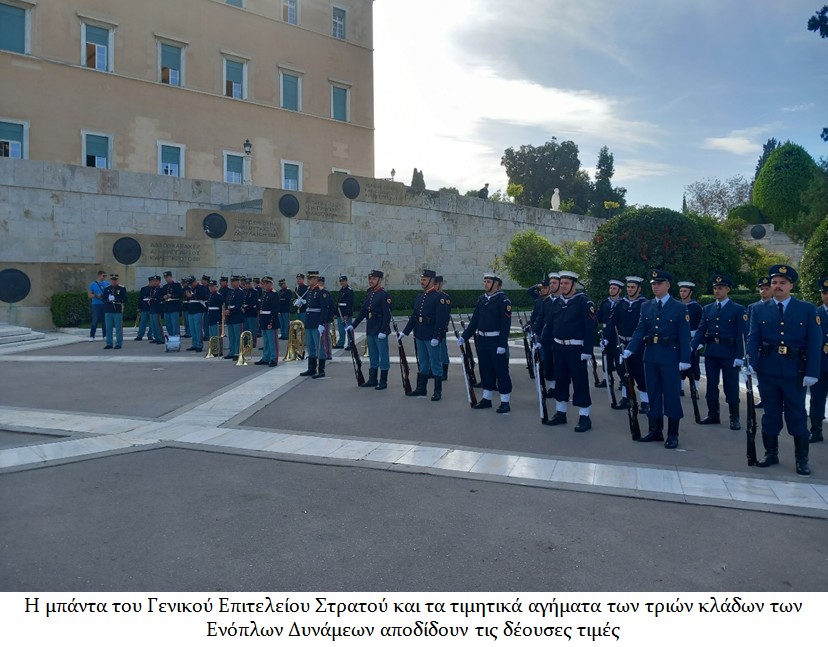 Τιμητικά αγήματατων τριών κλάδων των Ενόπλων Δυνάμεων και η μπάντα του Γενικού Επιτελείου Στρατού απέδωσαν τις δέουσες τιμές.