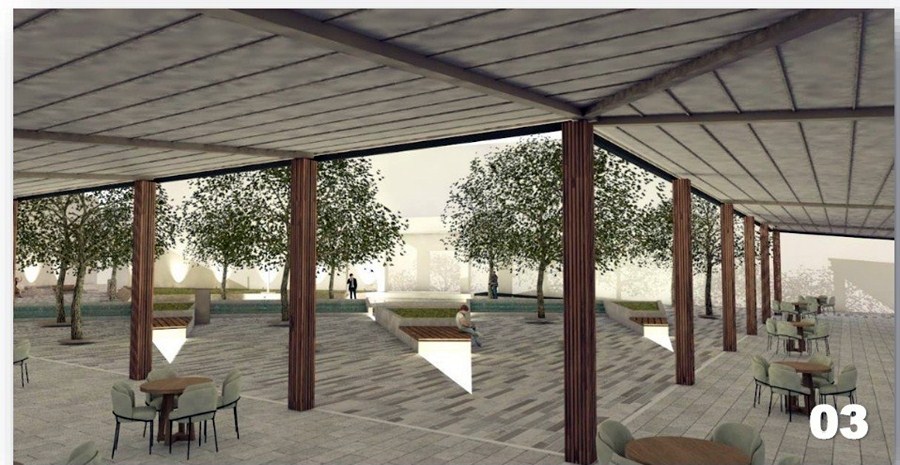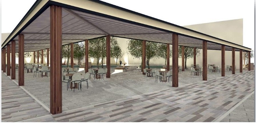 Πιο συγκεκριμένα, δίνεται μια λωρίδα πλάτους 2 μ. έμπροσθεν των καταστημάτων και μια ζώνη βάθους 8μ. σε σχήμα Γ, στην οποία προβλέπεται ενιαία ομοιόμορφη μεταλλική κατασκευή στεγάστρου, με δυνατότητα ανοιγοκλεινόμενης οροφής τμηματικά, με ειδικό πανί αντοχής και σύστημα συγκέντρωσης των όμβριων υδάτων. Το μεταλλικό στέγαστρο θα έχει μορφή μονόκλινη με κλίση 10%, με το ψηλότερο τμήμα του προς το Δικαστικό μέγαρο για τη βέλτιστη θέαση του κτιρίου. Το ύψος του ορίζεται στο χαμηλότερο σημείο να φτάνει στα 3μ. και το ψηλότερο στα 4μ. θα στηρίζεται σε μεταλλικές κολώνες υπενδεδυμένες με τσιμεντοσανίδα και ξύλο και θα φέρουν εσωτερικές υδρορροές, οι οποίες θα