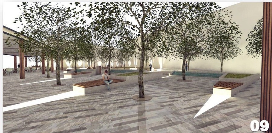 καταλήγουν σε κανάλι συλλογής όμβριων υδάτων. Η ανοιγοκλεινόμενη οροφή της θα εξασφαλίζει τόσο σκίαση και προστασία από βροχοπτώσεις, όσο και συνεχή κυκλοφορία του αέρα για λόγους δροσισμού και αερισμού. Πρόκειται δηλαδή για μια μεταλλική ελαφριά κατασκευή, η οποία θα αναβαθμίσει την αισθητική εικόνα των υφιστάμενων διαφορετικών συστημάτων σκίασης, θα λύσει λειτουργικά προβλήματα καίριας σημασίας και ταυτόχρονα θα βοηθήσει την οικονομική ανάπτυξη της περιοχής με τις υπάρχουσες χρήσεις αναψυχής. Με το νέο σχεδιασμό επίσης προβλέπεται σημαντική αύξηση της επιφάνειας φύτευσης, με το μεγαλύτερο ποσοστό να συγκεντρώνεται γύρω από τα ιστορικά κτίρια της πλατείας με στόχο την καλύτερη ανάδειξή τους. Η φύτευση ξεκινάει αριστερά της εισόδου από τον πεζόδρομο Πλαστήρα και συνεχίζει αριστερά μπροστά από το κτίριο της Επισκοπής, αφήνοντας ελεύθερες τις υπάρχουσες προσβάσεις στο κτίριο. Με την ίδια φιλοσοφία αντιμετωπίζεται και η φύτευση περιμετρικά του κτιρίου των Δικαστηρίων με μεγάλες επιφάνειες πρασίνου στην κεντρική όψη του και μικρότερες λωρίδες στις