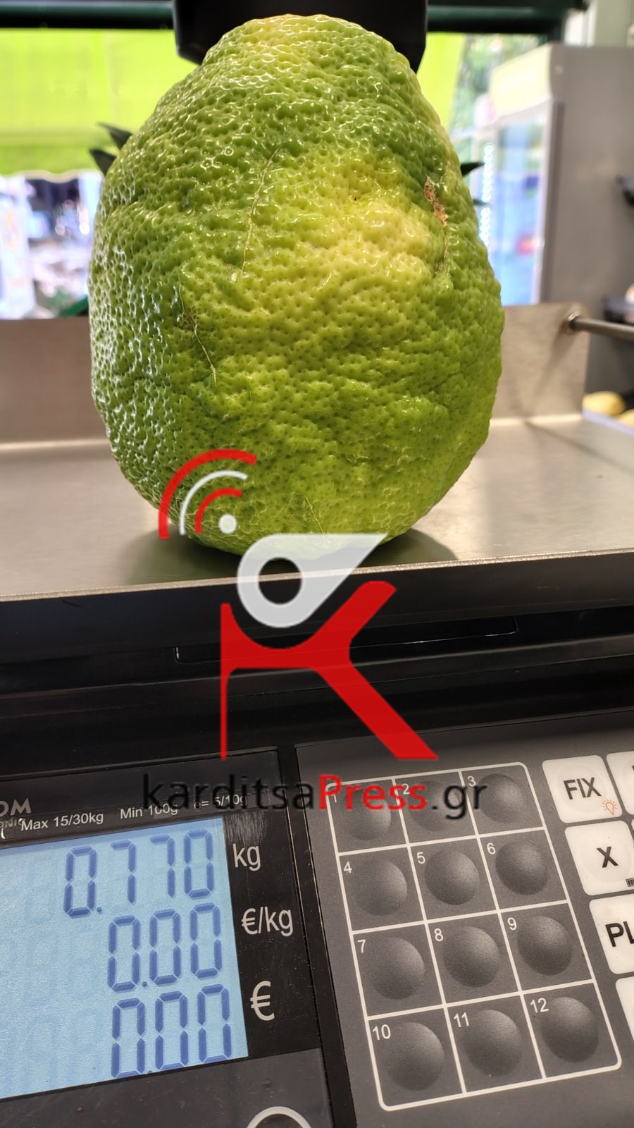 Ένα λεμόνι-γίγας βάρους 770 γραμμαρίων εντυπωσιάζει με το μέγεθός του. Το εσπεριδοειδές, που όπως μάθαμε προέρχεται από λεμονιά φυτεμένη σε μεγάλη γλάστρα, θυμίζει περισσότερο...πεπόνι παρά λεμόνι.