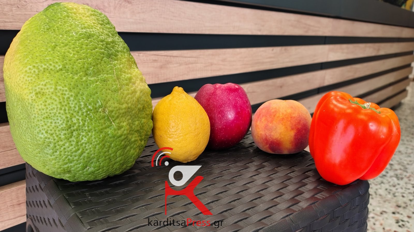 Στη φωτογραφία , το λεμόνι στέκεται δίπλα σε ένα ...κανονικό λεμόνι, ένα μήλο, ένα ροδάκινο και μια κόκκινη πιπεριά – και η διαφορά μεγέθους είναι τέτοια που κάνει τα υπόλοιπα να μοιάζουν με… μινιατούρες. Η σκληρή, τραχιά φλούδα του δίνει ακόμη πιο επιβλητική όψη, κάνοντάς το να θυμίζει περισσότερο εξωτικό φρούτο παρά κάτι που φυτρώνει σε μια γλάστρα στο μπαλκόνι.