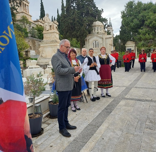 Το πλήθος των Καρδιτσιωτών, των εκπροσώπων των φορέων και των σωματείων που προσήλθαν στο Α’ Νεκροταφείο Αθηνών, καλωσόρισε εκ μέρους του διοργανωτή Συλλόγου, ο Πρόεδρος του Δ.Σ., κ. Κων/νος Κουσαής, ο οποίος ευχαρίστησε όλους τους παρευρεθέντες, που αψήφησαν τις αντίξοες καιρικές συνθήκες που επικρατούσαν την ημέρα εκείνη στην πρωτεύουσα. Αναφέρθηκε, επίσης, στη σημασία θεσμοθέτησης της ετήσιας τιμητικής εκδήλωσης όλα αυτά τα χρόνια από τον κεντρικό φορέα των Καρδιτσιωτών για τους δύο σπουδαίους αυτούς Καρδιτσιώτες Άνδρες, που σφράγισαν με την παρουσία τους τη σύγχρονη Ελληνική ιστορία, καταλαμβάνοντας επάξια τα ανώτατα αξιώματα της πολιτικής και θρησκευτικής ηγεσίας της χώρας μας.
