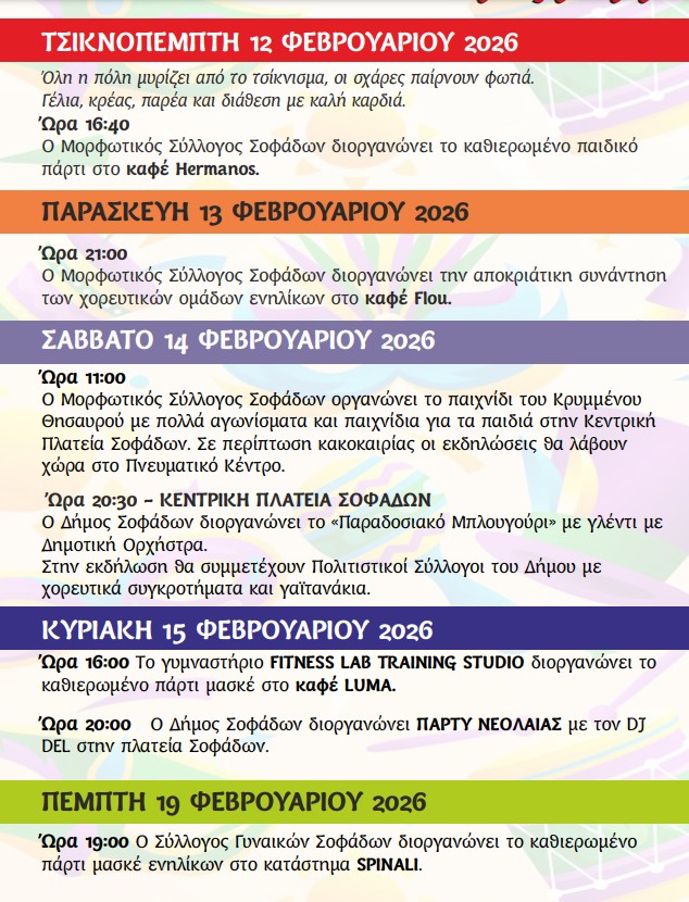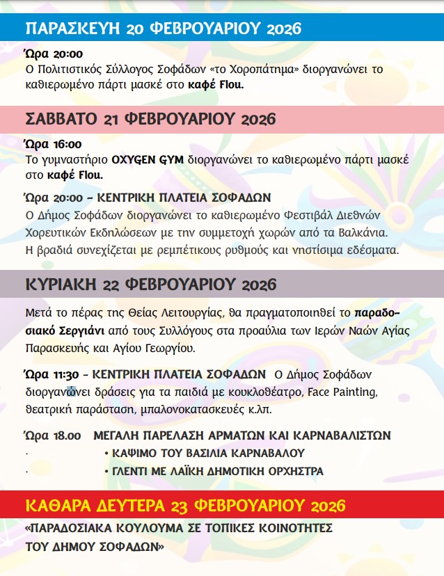 Ο Δήμος Σοφάδων καλεί δημότες και επισκέπτες να συμμετάσχουν ενεργά, να φορέσουν τη στολή τους και να γίνουν μέρος μιας μεγάλης συλλογικής εμπειρίας χαράς, κεφιού και αισιοδοξίας.