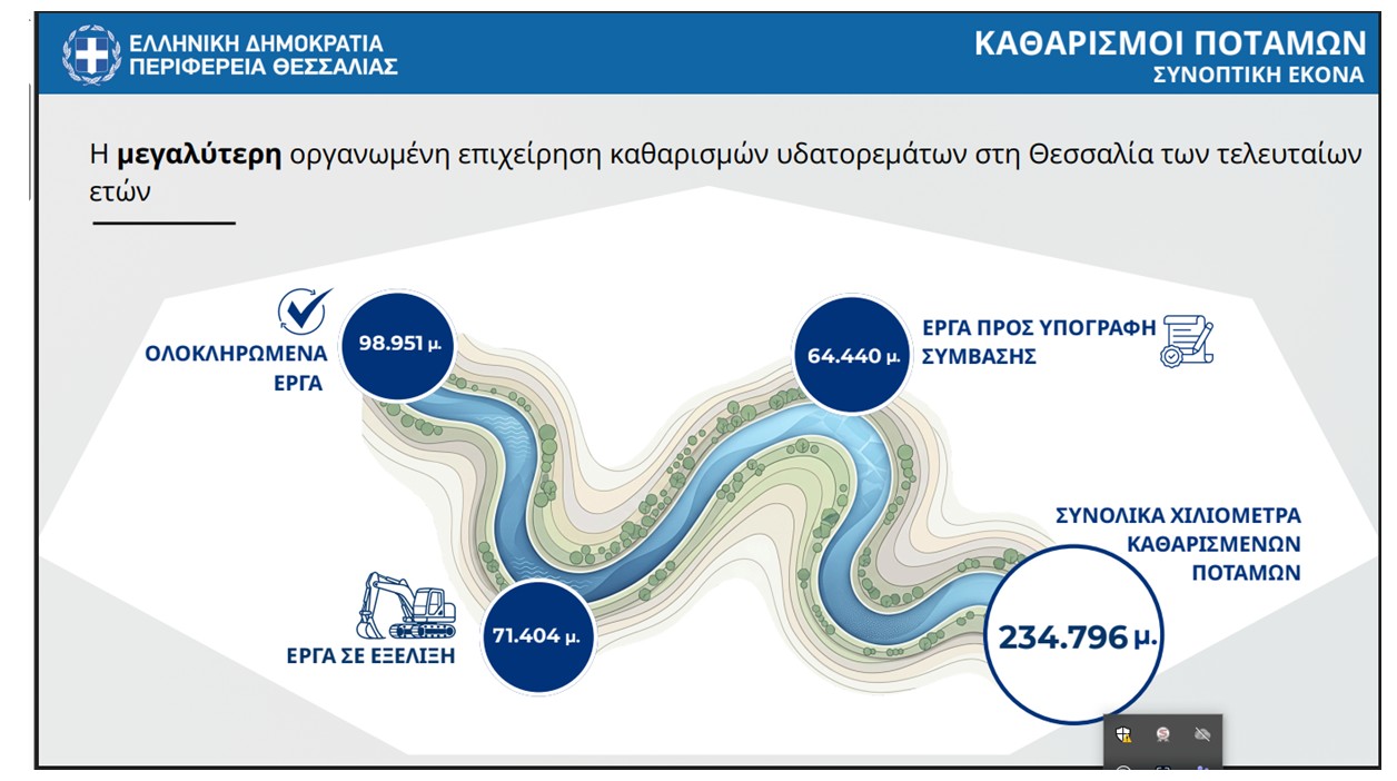 άμεσα κρίσιμα προβλήματα για την προστασία οικισμών και υποδομών». Κατέστησε σαφές ότι το ζήτημα της ανθεκτικότητας της Θεσσαλίας αποτελεί κεντρική στρατηγική επιλογή και ζήτημα υψίστης σημασίας. Στο πλαίσιο αυτό, η Περιφέρεια, πέραν των έργων που έχουν γίνει ή ολοκληρώνονται, συνεχίζει να διεκδικεί ένα ολοκληρωμένο πρόγραμμα έργων για το σύνολο της Θεσσαλίας,