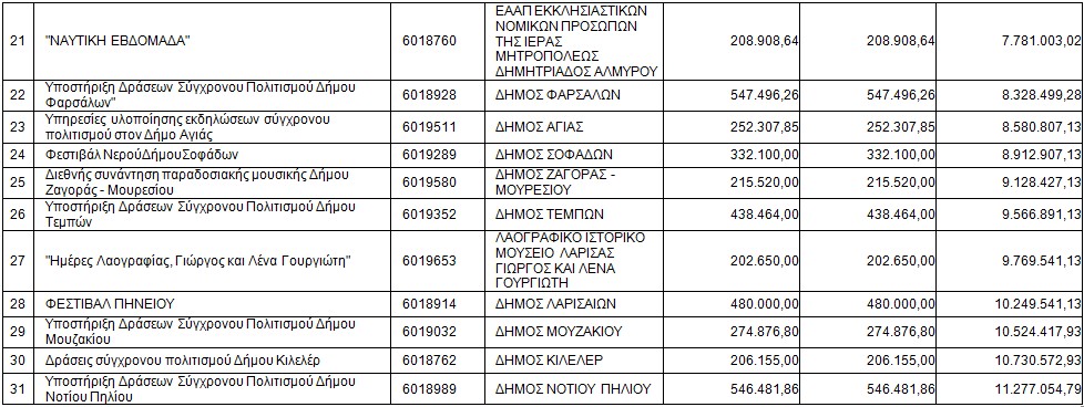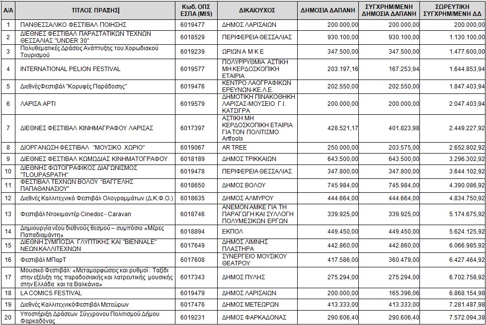 Ο Περιφερειάρχης Θεσσαλίας Δημήτρης Κουρέτας ανέφερε: Η Περιφέρεια Θεσσαλίας εφαρμόζει, για πρώτη φορά στην Ελλάδα, ένα πρωτοποριακό πρόγραμμα χρηματοδότησης μέσω ΕΣΠΑ, φορέων πολιτισμού. Χρηματοδοτούνται θεσμοί και πρόσωπα που έχουν αφιερώσει τη ζωή τους στην δημιουργία και στήριξη πολιτιστικών δράσεων. Δήμοι με τις πολλαπλές πολιτιστικές τους δραστηριότητες, οι πολιτιστικές προτάσεις της Περιφέρειας Θεσσαλίας αλλά και ΑΜΚΕ με ιστορία και διαδρομή μακρόχρονη στην επιτέλεση κοινωνικού και πολιτισμικού έργου, ενισχύονται με ένα χρηματοδοτικό πενταετές πρόγραμμα κοντά στα 12 εκ ευρώ. Εύκολα γίνεται κατανοητό το μεγάλο όφελος μιας τέτοιας χρηματοδοτικής ενίσχυσης. Στη Θεσσαλία δρουν εξαιρετικά σημαντικοί φορείς, δημόσιοι και ιδιωτικοί: Φεστιβάλ ποίησης, φεστιβάλ κόμικς και κινηματογράφου, μουσικά χωριά, συναντήσεις συναυλιακές και σεμιναριακές ως προς την κλασσική μουσική, θεματικά φεστιβάλ κάθε είδους κτλ – όλες αυτές οι δραστηριότητες αποκτούν χρηματοδοτικά εργαλεία που θα διασφαλίσουν την απρόσκοπτη πραγμάτωση τους, τη βελτίωση και την εξέλιξη τους, τη θεσμική τους συντήρηση και επιβίωση για μακρό χρονικό διάστημα. Στο πρόγραμμα ΕΣΠΑ 39 έχουν προκριθεί και εγκριθεί 31 προτάσεις, από την Περιφέρεια, τους δήμους της Θεσσαλίας και πολλές ΑΜΚΕ με αντικείμενο δράσης πολιτισμού. Είμαστε χαρούμενοι για την πρωτοβουλία μας αυτή και πιστεύουμε πως θα βρει μιμητές σε όλες τις Περιφέρειες της χώρας, έτσι ώστε να ενισχυθούν σε πανελλήνιο επίπεδο τόσο οι άνθρωποι όσο και οι φορείς που παράγουν πολιτισμό και προάγουν την καλλιτεχνική και την γενικότερη πνευματική δημιουργία».