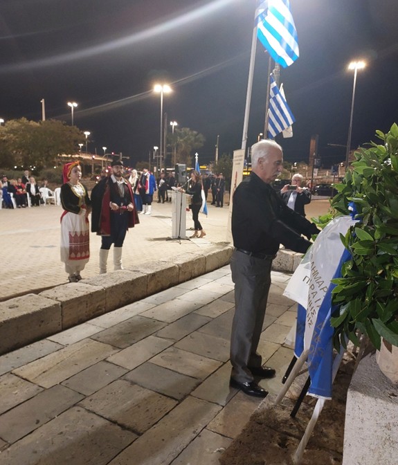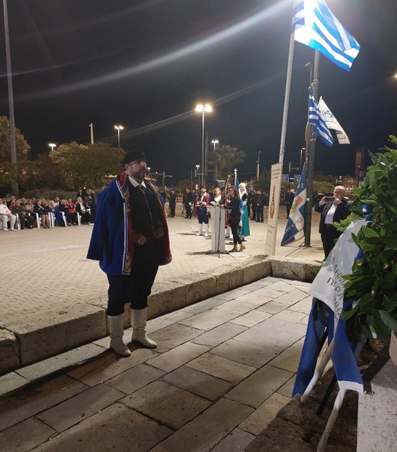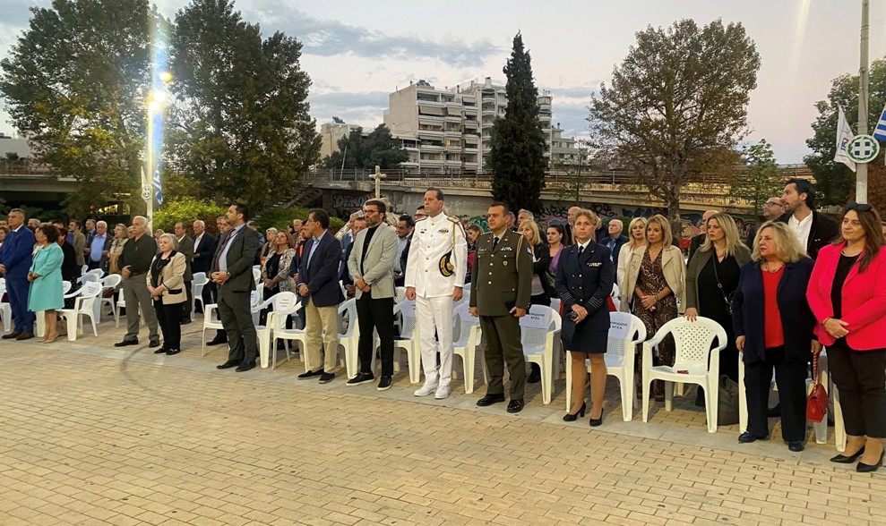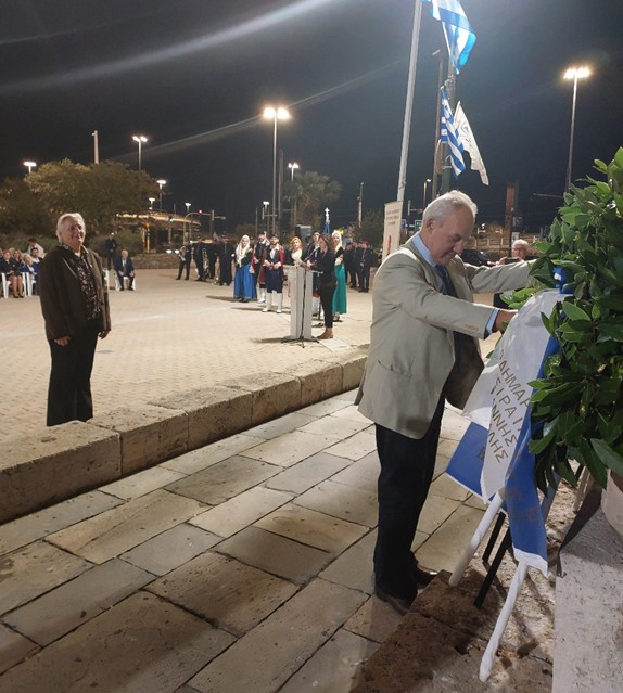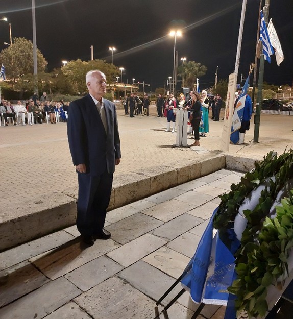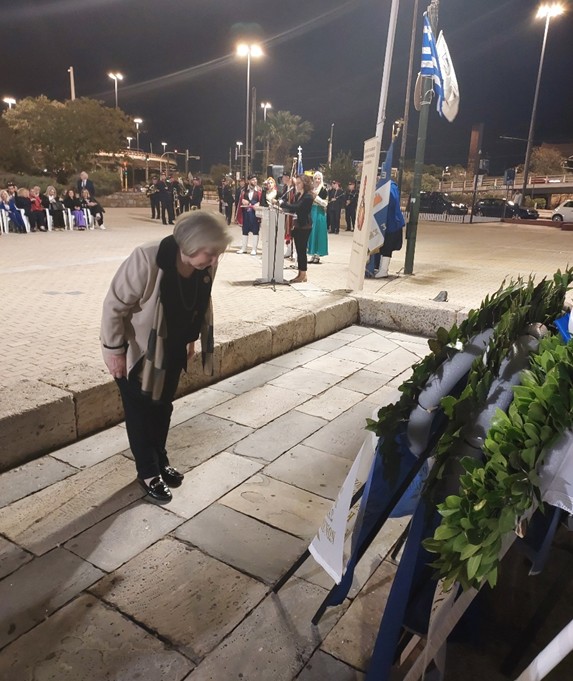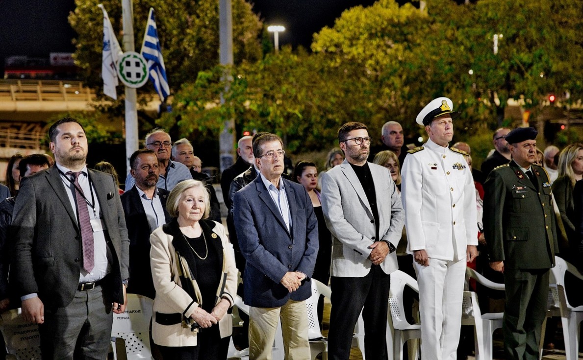 Μετά την ομιλία ακολούθησε κατάθεση στεφάνων από τους φορείς και τους συλλόγους, εν συνεχεία, σε κλίμα συγκίνησης, τηρήθηκε ενός λεπτού σιγή και ακολούθησε η ανάκρουση του Εθνικού Ύμνου από την εντυπωσιακή Φιλαρμονική του Δήμου Πειραιώς.
