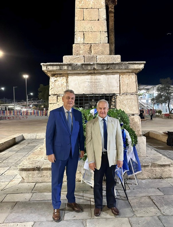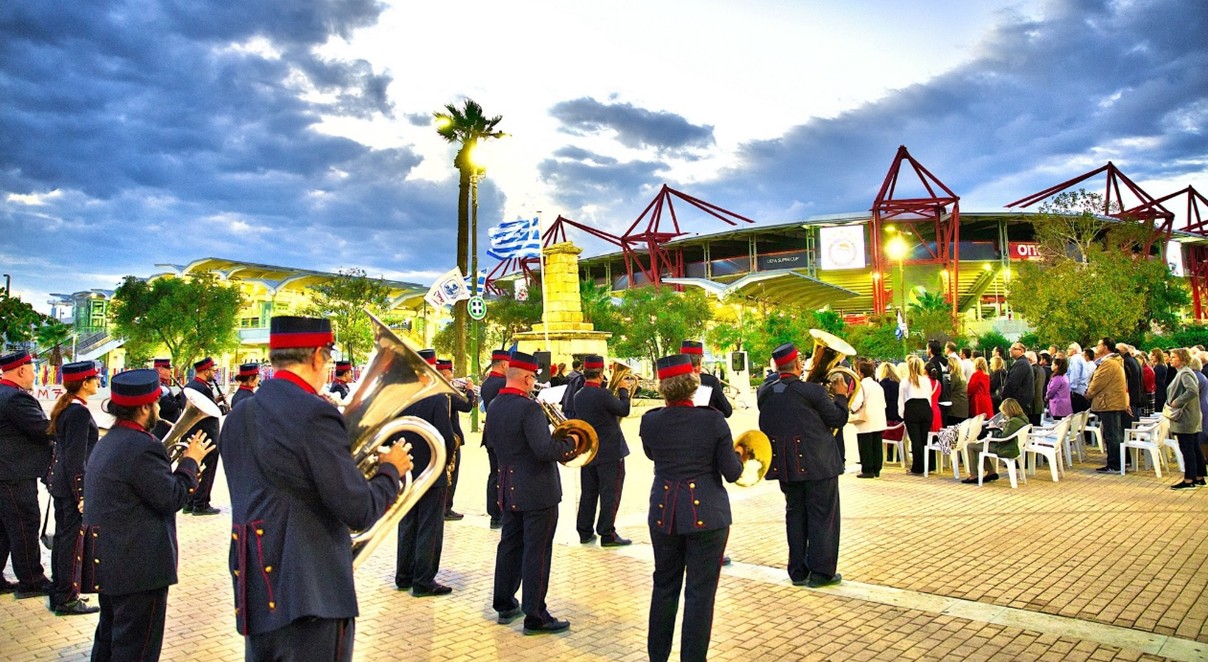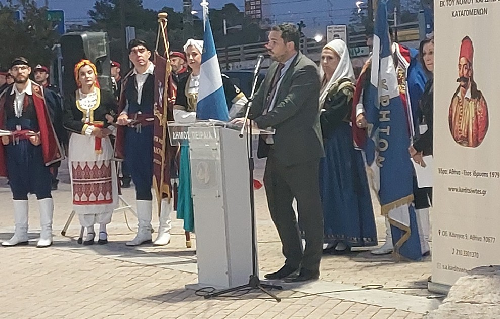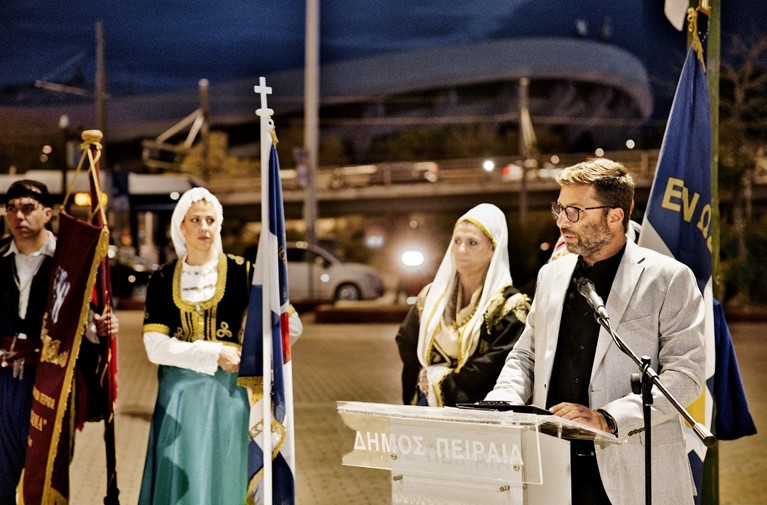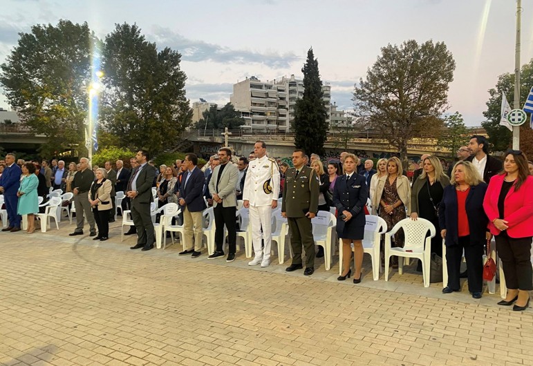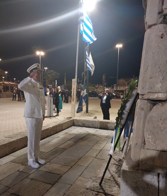 Μετά την ομιλία ακολούθησε κατάθεση στεφάνων από τους φορείς και τους συλλόγους, εν συνεχεία, σε κλίμα συγκίνησης, τηρήθηκε ενός λεπτού σιγή και ακολούθησε η ανάκρουση του Εθνικού Ύμνου από την εντυπωσιακή Φιλαρμονική του Δήμου Πειραιώς.