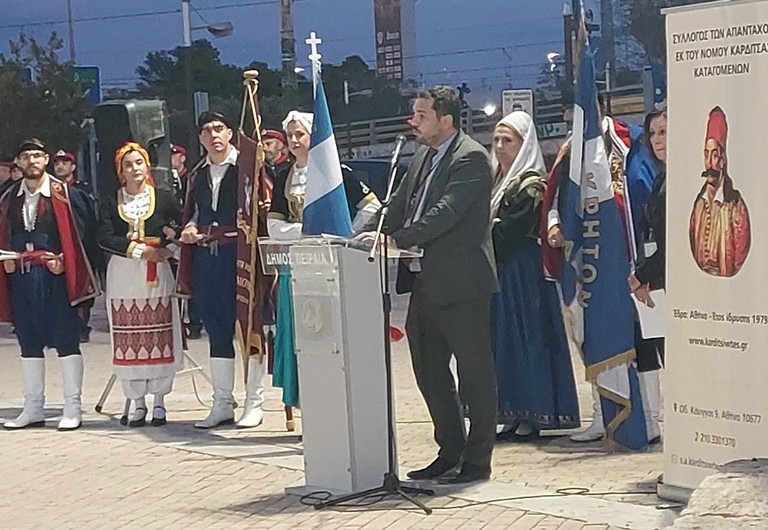 Τους χαιρετισμούς ολοκλήρωσε ο εκπρόσωπος του Δημάρχου Πειραιά, κ. Ιωάννη Μώραλη, εντεταλμένος σύμβουλος Πολιτισμού, κ. Ιωάννης Χατζηαλέξης, ο οποίος τόνισε ότι συνιστά ιδιαίτερη τιμή για τον Δήμο Πειραιά να θέσει υπό την αιγίδα του την εν λόγω σημαντική εκδήλωση και αναφέρθηκε στην ανδρεία και στον σπάνιο ηρωϊσμό που επέδειξε ο Καραϊσκάκης.