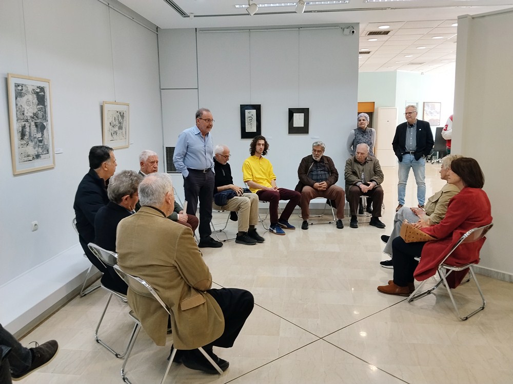 Μια ξενάγηση και μια ανοιχτή συνομιλία για τις σχέσεις Ζωγραφικής και Χαρακτικής υπήρξε το δέλεαρ για τη σύναξη αυτή. Η υπάλληλος της ΔΠΚ Μαρία Γιαννέλου σκιαγράφησε το χρονικό της μακρόχρονης συνεργασίας μεταξύ της ΔΠΚ και της Εταιρεία Εικαστικών Τεχνών Α. ΤΑΣΣΟΣ με την παρούσα έκθεση να αποτελεί την τρίτη της εκδήλωση. Ο κ. Μάνος Στεφανίδης, ιστορικός τέχνης και πρόεδρος της Καλλιτεχνικής Επιτροπής της ΔΠΚ φώτισε σημεία από την ιστορία της χαρακτικής, μίλησε για σημαντικούς εκπροσώπους της τέχνης αυτής στην Ελλάδα, ανέδειξε τη στενή συνάφεια αλλά και τα σημεία απόκλισης της ζωγραφικής και της χαρακτικής. Το μέλος της Καλλιτεχνικής Επιτροπής κ. Άκης Κοτρώτσιος και ο κ. Δημήτρης Βάλλας, ζωγράφοι και οι δύο, κατέθεσαν τις εμπειρίες τους από πειραματισμούς πάνω στην τέχνη της χαρακτικής. Ιδιαίτερο ενδιαφέρον είχε η παρουσία στην εκδήλωση των χαρακτριών κ. Χριστίνας Αγγέλου και κ. Μαρίας Γκαλιάτα που και οι δύο μυήθηκαν στη χαρακτική κατά την μαθητεία τους σε Σχολές Καλών Τεχνών. Αναφέρθηκαν με θέρμη στην μαγεία που εισπράττουν από την ενασχόληση με την τεχνολογία της χαρακτικής, αλλά και τις πρακτικές δυσκολίες που αντιμετωπίζουν ως ενεργές καλλιτέχνιδες. Στην Ελλάδα, υπάρχουν ελάχιστα οργανωμένα εργαστήρια χαρακτικής όπου οι ελεύθεροι καλλιτέχνες μπορούν να τυπώσουν έργα τους, γεγονός που λειτουργεί ανασταλτικά προς την ανάπτυξη της τέχνης αυτής. Ένας τόνος αισιοδοξίας προστέθηκε από την αυτοδίδακτη στη χαρακτική αλλά και ενθουσιώδη SOURTOUKA που την αξιοποιεί στην δουλεία της, όπως και ο JOLA που την έχει διδαχτεί και την υπηρετεί μέσω των γραφικών τεχνών. Απορίες και σκέψεις για την λειτουργία των πολλαπλών, τη σχέση της χαρακτικής με την φωτογραφία, αναφορά στο βιβλίο του Βάλτερ Μπένγιαμιν ‘’Το έργο τέχνης στην εποχή της τεχνικής αναπαραγωγιμότητάς του’’ και τον εκδημοκρατισμό της τέχνης μέσω της χαρακτικής. Μνήμες από την κοινή έκθεση με έργα των Α. ΤΑΣΣΟΥ και Δ. Γιολδάση από την Λαϊκή Βιβλιοθήκη ‘’Η ΑΘΗΝΑ’’, περίπου έξι δεκαετίες παλιότερα και η προσωπική γνωριμία του κ. Απόστολου Πίτσαβου με τον σημαντικό χαράκτη.