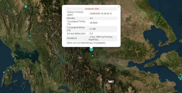Σεισμός 4,2 Ρίχτερ σημειώθηκε στην Ρεντίνα Καρδίτσας.