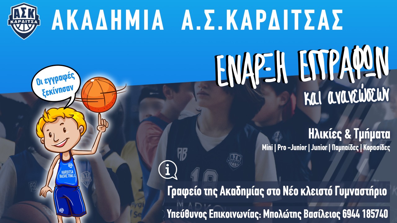 Με ένα ολοκληρωμένο πρότυπο πρόγραμμα προπονήσεων και δράσεων, με οργάνωση και καινοτομίες, ξεκινούν οι νέες εγγραφές και ανανεώσεις εγγραφών για τις ακαδημίες μπάσκετ του Α.Σ. Καρδίτσας.