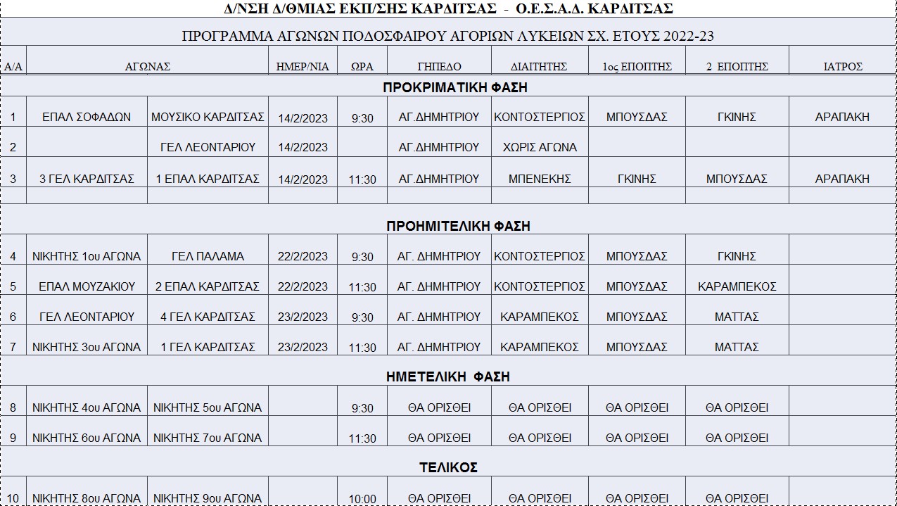 Πρόγραμμα ποδοσφαίρου αγοριών Λυκείων ΠΟΔΟΣΦΑΙΡΟ Previous Article Νέο ΔΣ στο Σύνδεσμο Διαιτητών Ποδοσφαίρου Ν. Καρδίτσας Next Article Ευχαριστήριο Α.Ο. Αετού Καλλιφωνίου για την αγορά απινιδωτή Typography Font Size Default Reading Mode Share This Από τη Διεύθυνση Δευτεροβάθμιας Εκπαίδευσης ανακοινώνεται το πρόγραμμα ποδοσφαίρου αγοριών Λυκείων Previous Article Νέο ΔΣ στο Σύνδεσμο Διαιτητών Ποδοσφαίρου Ν. Καρδίτσας Next Article Ευχαριστήριο Α.Ο. Αετού Καλλιφωνίου για την αγορά απινιδωτή