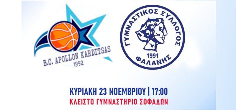 Η αναμέτρηση διεξάγεται στους Σοφάδες, αντί του Κλειστού Γυμναστηρίου του Ε.Α.Κ. Καρδίτσας καθώς, στη φυσική έδρα του Απόλλωνα, διεξάγεται το Σαββατοκύριακο (22-23/11) το Πανελλήνιο Πρωτάθλημα Πάλης U11 & U13.