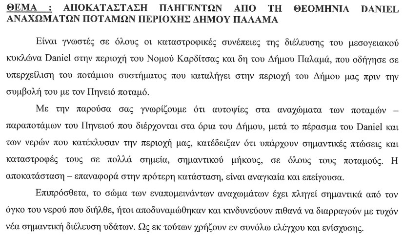 Σε έγγραφό του προς την Περιφέρεια Θεσσαλίας, το Υπουργείο Μεταφορών και το Υπουργείο Κλιματικής Κρίσης και Πολιτικής Προστασίας προειδοποιεί για νέα πλημμυρικά φαινόμενα ενόψει του χειμώνα αν δεν αποκατασταθούν τα φράγματα που υπέστησαν σημαντικές ζημιές κατά την πρόσφατη φονική κακοκαιρία. Μάλιστα όπως σημειώνεται στο έγγραφο ο Δήμος Παλαμά μετά τις πλημμύρες δεν διαθέτει ούτε ένα μηχάνημα έργου.