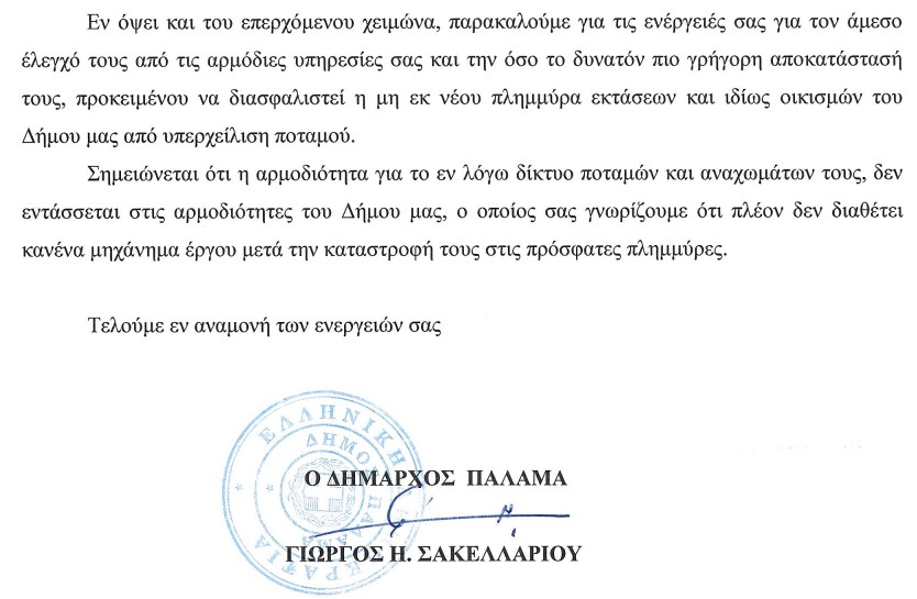 Τον κώδωνα του κινδύνου για την κατάσταση των αναχωμάτων στην περιοχή του Δήμου Παλαμά κρούει ο Δήμαρχος κ. Γιώργος Σακελλαρίου.