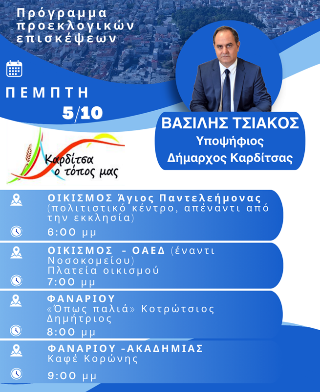 Τις επισκέψεις συνεχίζει ο επικεφαλής του συνδυασμού «Καρδίτσα ο τόπος μας», νυν και εκ νέου υποψήφιος Δήμαρχος Καρδίτσας, κ. Βασίλης Τσιάκος.
