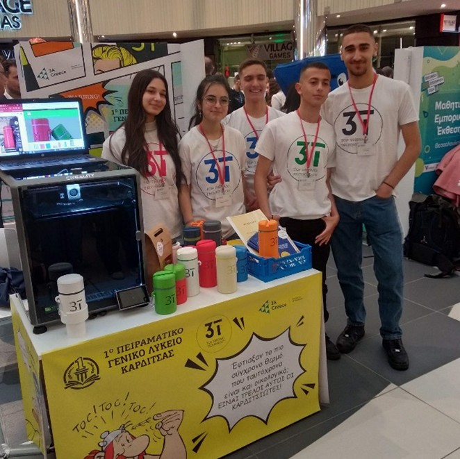 Στην εμπορική έκθεση συμμετείχε για πρώτη φορά το 1ο Πειραματικό ΓΕΛ Καρδίτσας με την Εικονική Επιχείρηση 3TTOPTHERMOTECHNOLOGY, που συστάθηκε από τους ομίλους «Επιχειρηματικότητας» και «3DBotics».Η επιχείρησή μας 3T (Τop,Τhermos,Τechnology) κατασκευάζει θερμός έχοντας ως βασικό υλικό ανακυκλώσιμα γυάλινα βάζα, που αρχικά συγκεντρώνουμε στο σχολείο μας σε ειδικούς κάδους. Έχοντας διαπιστώσει ότι μεγάλες ποσότητες γυαλιού πηγαίνουν στα σκουπίδια, σκεφτήκαμε τρόπους μετατροπής των γυάλινων βάζων σε χρηστικά αντικείμενα, όπως το θερμός,ενισχύοντας την κυκλική οικονομία και την ανακύκλωση. Το προϊόν μας σχεδιάστηκε και κατασκευάστηκε εξ ολοκλήρου στο εργαστήριο Πληροφορικής και 3Dεκτύπωσης του σχολείου μας. Η παραγωγή και η συμμετοχή μας στην έκθεση πραγματοποιήθηκε με την υποστήριξη του Υπουργείου Ψηφιακής Διακυβέρνησης και τις ευγενικές χορηγίες της Περιφέρειας Θεσσαλίας, του Δήμου Καρδίτσας του Εμπορικού Επιμελητηρίου, καθώς και επιχειρηματιών που δραστηριοποιούνται στην πόλη μας.