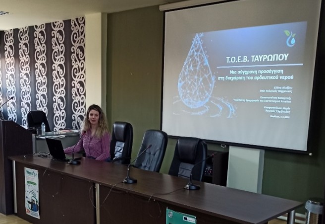 Τους εκπροσώπους του ΤΟΕΒ Ταυρωπού Καρδίτσας,κ. Ελένη Αλεξίου,MSc Πολιτικό Μηχανικό, κ. Κωνσταντίνο Κιουρτσή, Υπεύθυνο Εφαρμογών και Συντονισμού Δικτύου, κ. Μαρία Κουφοπούλου, Νομικό Σύμβουλο με θέμα: «Μια σύγχρονη προσέγγιση στη διαχείριση του αρδευτικού νερού». Έγινε ενημέρωση για τον Οργανισμό Εγγείων Βελτιώσεων Ταυρωπού, τοΕγγειοβελτιωτικό έργο, τα Προβλήματα λειτουργίας του υφιστάμενου αρδευτικού έργου Ταυρωπού,  τα Ευρωπαϊκά και ερευνητικά προγράμματα διαχείρισης νερού που συμμετέχει ο Οργανισμός και τέλος την πορεία υλοποίησης του νέου κλειστού αρδευτικού δικτύουΤαυρωπού.