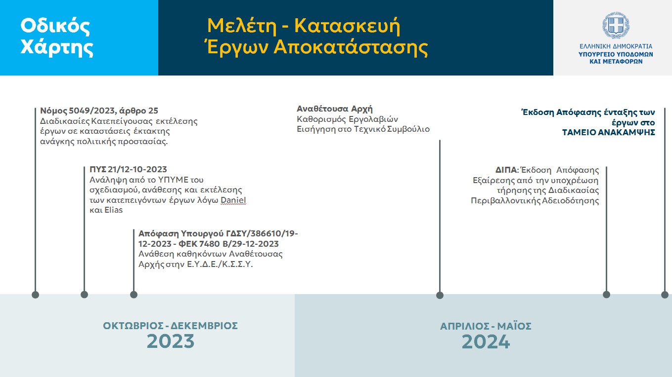 Σύμφωνα με την πολιτική ηγεσία του Υπουργείου Υποδομών και Μεταφορών, η αποκατάσταση, με υψηλότερη ανθεκτικότητα των υποδομών, που έχει αναλάβει το Υπουργείο, προσεγγίζει ή και υπερβαίνει τα 1,4 δισ. ευρώ.