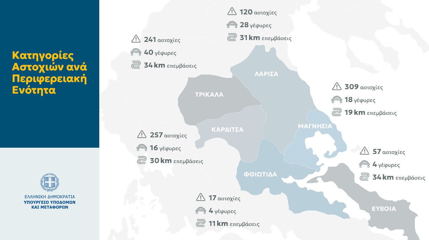 Από αυτά, τα 900 εκατ. ευρώ αφορούν οδικά έργα, τα 463 εκατ. ευρώ σιδηροδρομικά έργα και συγκεκριμένα, το κεντρικό σιδηροδρομικό δίκτυο και τα τμήματα Λάρισα – Βόλος και Παλαιοφάρσαλος – Καλαμπάκα, καθώς και 33 σχολεία, το κόστος αποκατάστασης των οποίων ανέλαβε η Ένωση Ελλήνων Εφοπλιστών (ΕΕΕ).