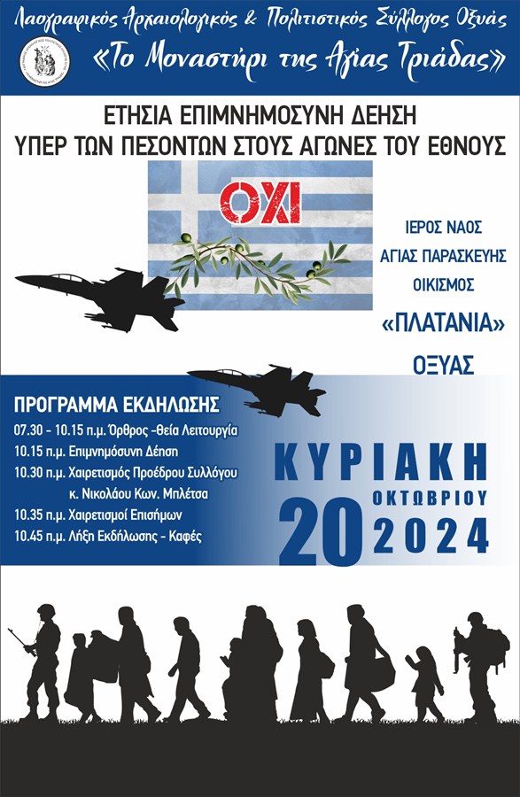 Διοργανώνεται από το Λαογραφικό, Αρχαιολογικό και Πολιτιστικό Σύλλογο Οξυάς «το μοναστήρι της Αγίας Τριάδας», με τη στήριξη και της Περιφέρειας Θεσσαλίας/ΠΕ Καρδίτσας, και αποτελεί ελάχιστο φόρο τιμής για εκείνους που θυσιάστηκαν για την πατρίδα.