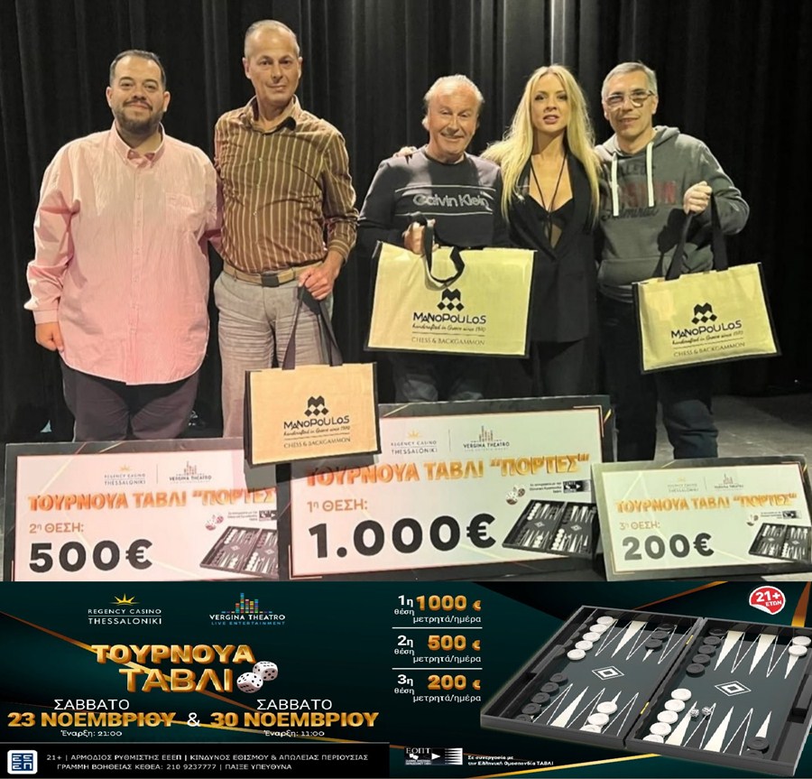 Πραγματοποιήθηκε το Σάββατο 23 Νοεμβρίου στο CASINO REGENCY της Θεσσαλονίκης, σε συνεργασία με την Ελληνική Ομοσπονδία Παραδοσιακού Τάβλι, το μεγαλύτερο τουρνουά τάβλι (ΠΟΡΤΕΣ) που έγινε τα τελευταια χρόνια στην Ελλάδα.