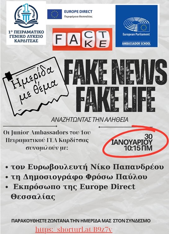 Με επιτυχία πραγματοποιήθηκε την Πέμπτη 30 Ιανουαρίουη διαδικτυακή ημερίδα με τίτλο«FakeNews –FakeLife» και θέμα την παραπληροφόρηση στα ΜΜΕ, η οποία διοργανώθηκε από την ομάδα μαθητών/πρεσβευτών της Ευρωπαϊκής Ένωσης - EPAS του 1ου Πειραματικού Λυκείου Καρδίτσας.