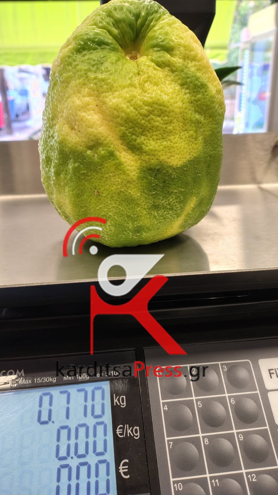 Ένα λεμόνι-γίγας βάρους 770 γραμμαρίων εντυπωσιάζει με το μέγεθός του. Το εσπεριδοειδές, που όπως μάθαμε προέρχεται από λεμονιά φυτεμένη σε μεγάλη γλάστρα, θυμίζει περισσότερο...πεπόνι παρά λεμόνι.