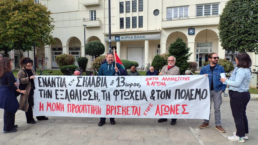 Οι συγκεντρωμένοι κατήγγειλαν το νομοσχέδιο που «θεσμοθετεί τη 13ωρη εργασία» και «σβήνει τα όρια ανάμεσα στην εργάσιμη και μη εργάσιμη ζωή», τονίζοντας ότι μετατρέπει τους εργαζόμενους «σε μηχανές που ζουν για να δουλεύουν».