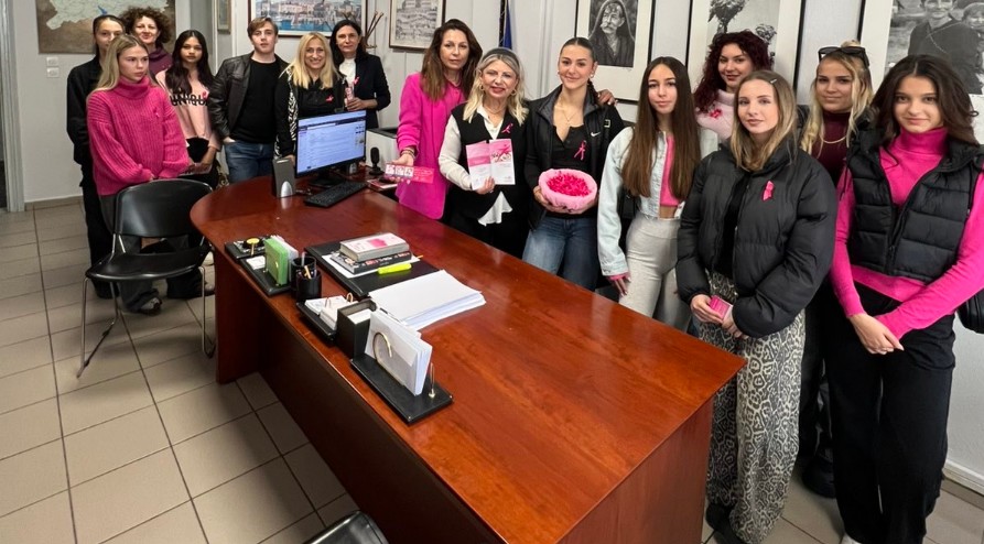 Στο πλαίσιο των δράσεων ευαισθητοποίησης, μια αντιπροσωπευτική ομάδα εκπαιδευτικών και μαθητών επισκέφθηκε το γραφείο της Διευθύντριας Δευτεροβάθμιας Εκπαίδευσης, κ. Ξυνοπούλου. Εκεί, μετέφεραν το μήνυμα της πρόληψης και τοποθέτησαν το συμβολικό ροζ φιογκάκι στους υπαλλήλους, μετατρέποντας το γραφείο σε χώρο έμπρακτης στήριξης του αγώνα κατά της νόσου.