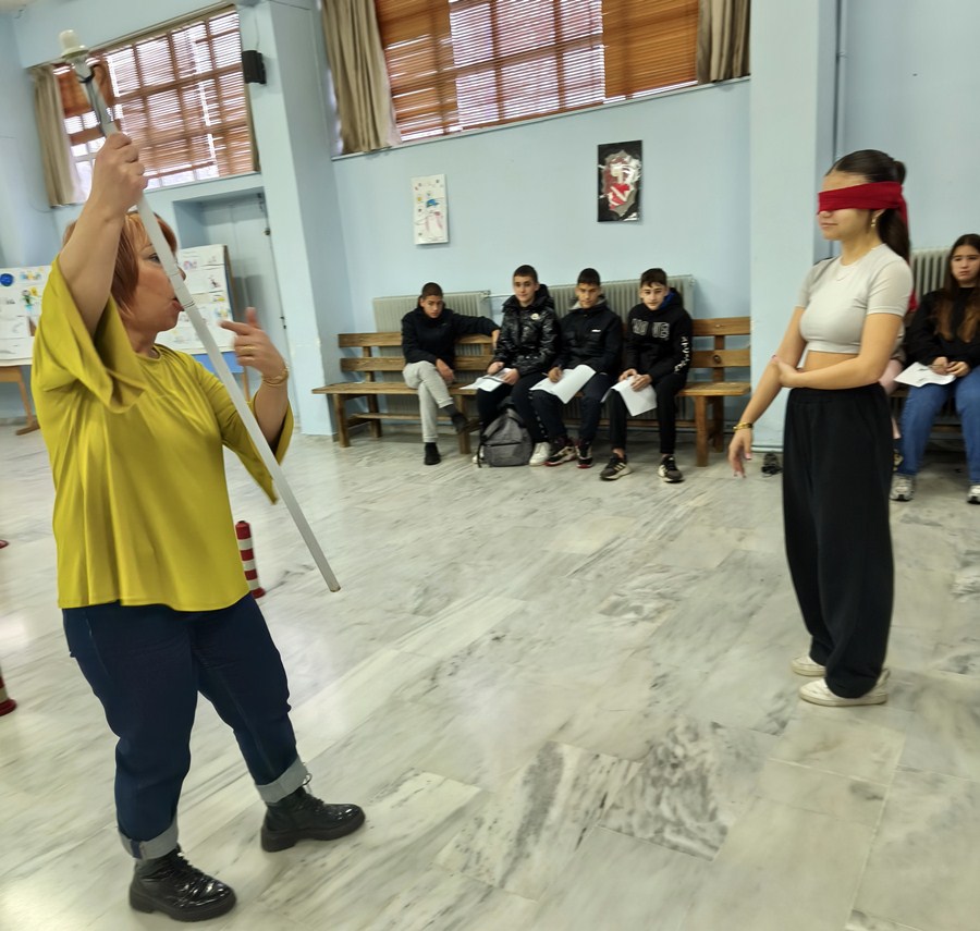 Οι μαθητές της Γ΄γυμνασίου με την επιμέλεια της Διαμαντή Γεωργίας συμμετείχαν σε δραστηριότητες που επικεντρώθηκαν κυρίως στην τυφλότητα και την κινητική αναπηρία, καθώς συμπλήρωσαν και ειδικά διαμορφωμένα ερωτηματολόγια που επικεντρώνονταν πάνω στο θέμα αυτό. Σε μία από τις βιωματικές ασκήσεις, μαθήτρια συμμετείχε με δεμένα μάτια σε προσομοίωση καθημερινών δυσκολιών. Με τη βοήθεια της εκπαιδευτικού και ενός λευκού μπαστουνιού που κατασκεύασε ο καθηγητής τεχνολογίας του σχολείου, προσπάθησε να διασχίσει έναν ειδικά διαμορφωμένο διάδρομο με εμπόδια και στη συνέχεια να αναγνωρίσει και να δοκιμάσει διαφορετικά υλικά τοποθετημένα σε πιάτο. Μέσα από τη δράση αυτή οι μαθητές κατανόησαν τις προκλήσεις που αντιμετωπίζουν οι άνθρωποι με απώλεια όρασης.