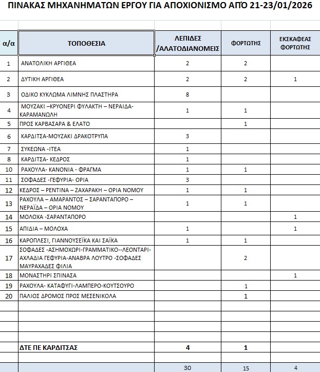 Καθ’ όλη τη διάρκεια της πρόσφατης κακοκαιρίας επιχειρούσαν συνολικά 49 μηχανήματα έργου (αλατιέρες, JCB και φορτωτές), συμβάλλοντας καθοριστικά στη διατήρηση της ασφαλούς και απρόσκοπτης κυκλοφορίας στο ορεινό οδικό δίκτυο.