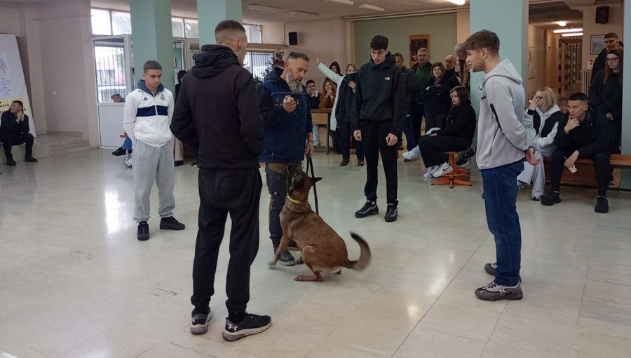 Η δράση κορυφώθηκε με την παρουσία των πιστοποιημένων εκπαιδευτών σκύλων, κας Πέννυς Τσέλιου και κ. Χρήστου Παπαγιάννη, οι οποίοι, μαζί με τον τετράποδο συνεργάτη τους, πραγματοποίησαν μια εντυπωσιακή επίδειξη εκπαίδευσης. Οι μαθητές είχαν την ευκαιρία να δουν από κοντά πώς χτίζεται η επικοινωνία και η εμπιστοσύνη μεταξύ εκπαιδευτή και σκύλου, κατανοώντας στην πράξη τη σημασία της υπεύθυνης κηδεμονίας.