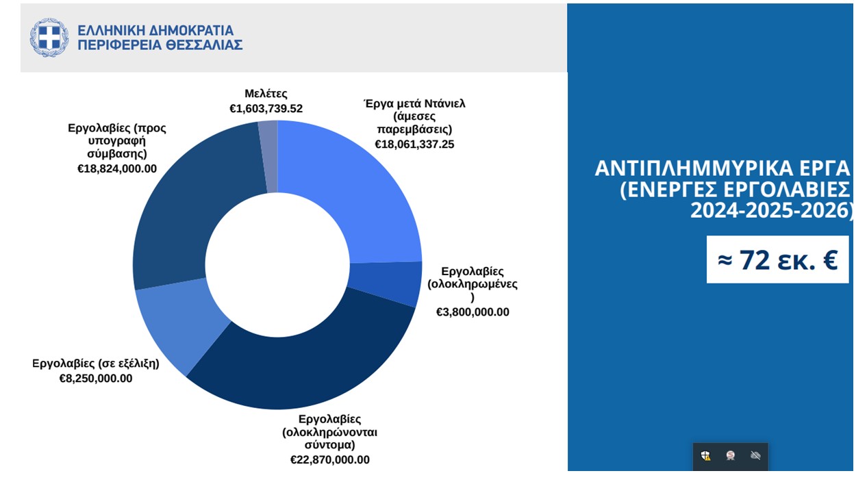 1. Από αυτά, έργα προϋπολογισμού 18 εκ. ευρώ που ολοκληρώθηκαν αφορούν εργασίες προσωρινής αποκατάστασης αναχωμάτων και λοιπών υποδομών σε περισσότερες από 110 θέσεις σε ολόκληρο το Νομό, αμέσως μετά το καταστροφικό πέρασμα του Ντάνιελ.