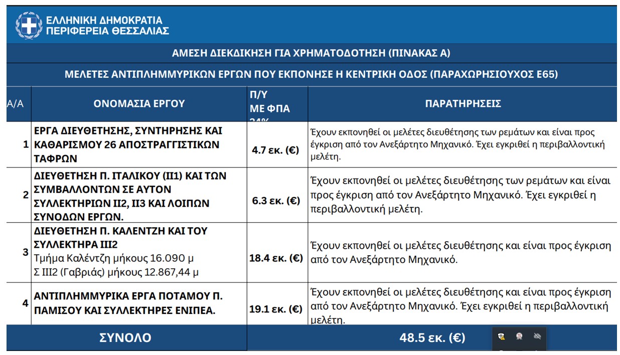 2.Την άμεση υλοποίηση των αντιπλημμυρικών έργων από την εταιρία «Κεντρική Οδός» (Παραχωρησιούχος Ε65)», σύμφωνα με τις μελέτες που εκπόνησε η ίδια, μετά την με αριθμ. πρωτ.ΕΥΔΕ/ΚΣΕΣΠ/Γ/Φ1/6694/16-09-2020 απόφαση Υπουργού Μεταφορών (Έργα του Πίνακα Α)