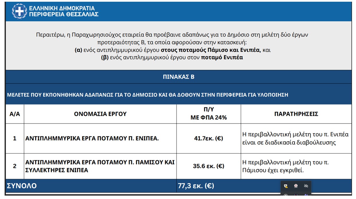Ο Δημ. Κουρέτας υπογράμμισε ότι από τις προαναφερόμενες εργολαβίες των αντιπλημμυρικών έργων που ολοκληρώνονται σύντομα, δύο (2) συνολικού προϋπολογισμού 12 εκ. ευρώ που αφορούν τους ποταμούς Ενιπέα (6 εκ.ευρώ) και Φαρσαλίτη (6 εκ. ευρώ), ενώ έργα ύψους 13,5 εκ. ευρώ που αφορούν τμήματα των ποταμών Πάμισου, Ενιπέα και Φαρσαλίτη βρίσκονται στη διαδικασία ολοκλήρωσης της ανάθεσης και υπογραφής των συμβάσεων.