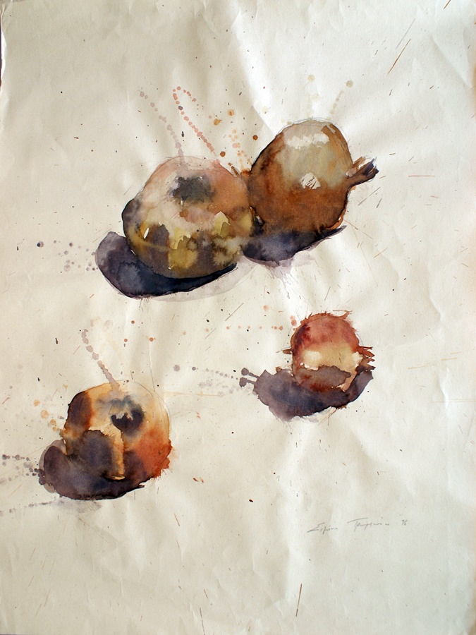 Σχέδιο λιτό, κάποιες στιγμές και νευρικό που ολοκληρώνεται και ηρεμεί με την προσθήκη χρώματος. Υδατογραφίες με τη διαφάνεια και τη ρευστότητα, βασικά δομικά εργαλεία και ταυτόχρονα στοιχεία εκφραστικότητας, που αποδίδουν τις αέρινες μνημονικές εγγραφές. Αδρά αναμεμειγμένα χρώματα πάνω στην εμφανή φέρουσα επιφάνεια. Συμπύκνωση και αφαιρετικότητα. Αναπαράσταση και ατμοσφαιρικότητα. Αυθορμητισμός και αυτοματισμός. Εμφανής χειρονομιακή διαπραγμάτευση και επιμέλεια. Τα αντικείμενα της καθημερινότητας ως τεκμήρια προϋπάρχουσας ζωής και δράσης. Ένα ιδιότυπο αρχείο συγκινήσεων.