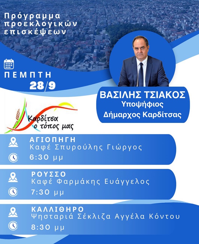 Τις επισκέψεις στις Τοπικές Κοινότητες της Καρδίτσας συνεχίζειο επικεφαλής του συνδυασμού «Καρδίτσα ο τόπος μας», νυν και εκ νέου υποψήφιος Δήμαρχος Καρδίτσας, κ. Βασίλης Τσιάκος.