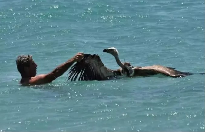 Παραλίγο να πνιγεί ένας γύπας ο οποίος αδύναμος και ταλαιπωρημένος έπεσε στη θάλασσα χωρίς να έχει τη δύναμη να πετάξει.