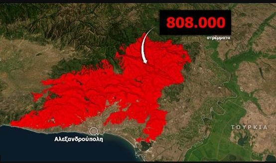 Νεότερη δορυφορική απεικόνιση της καμένης έκτασης στην μεγάλη πυρκαγιά στον Έβρο.