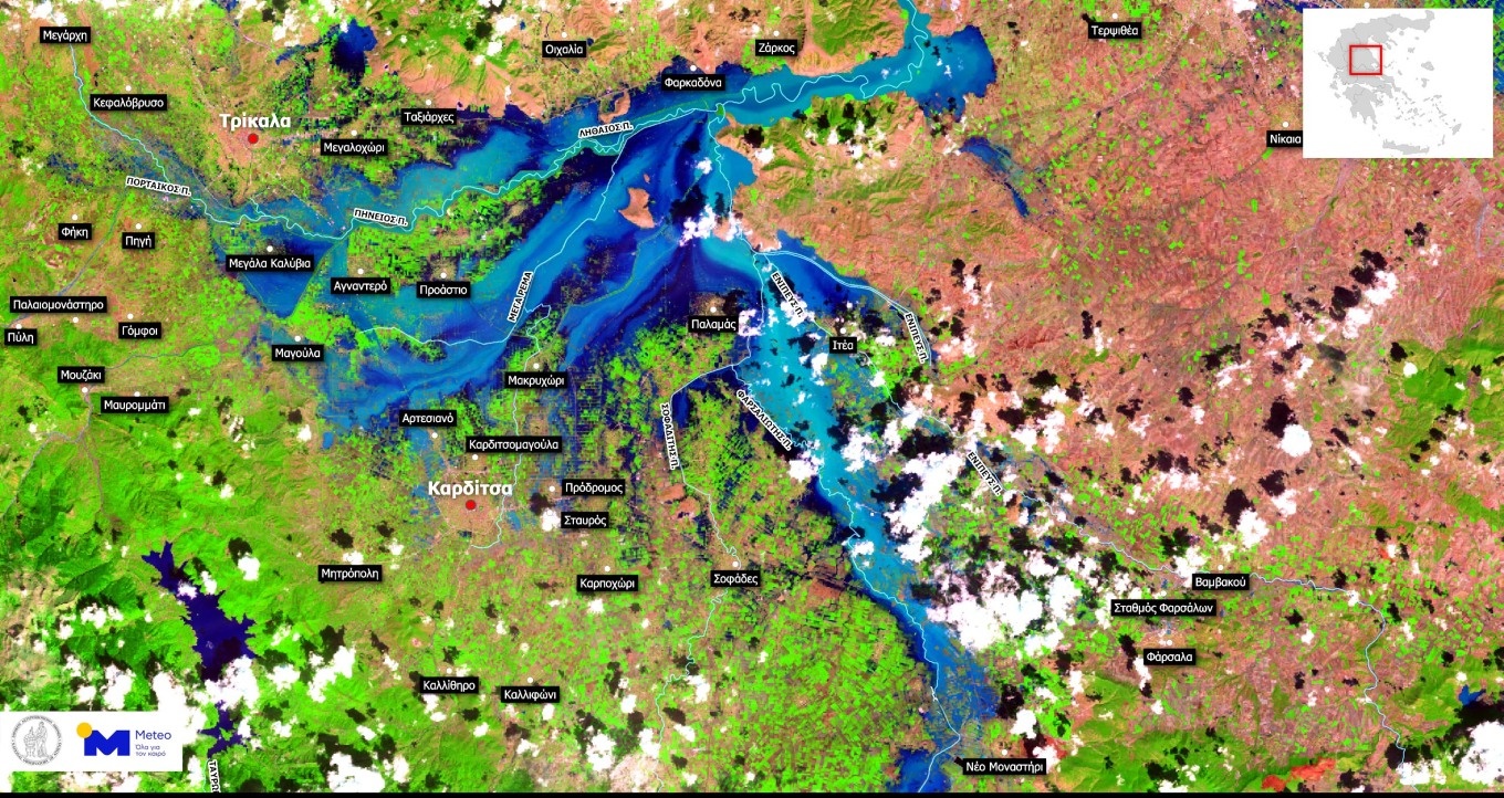 Δορυφορικά δεδομένα του αμερικανικού δορυφόρου Landsat-8 που πέρασε πάνω από τη χώρα μας το πρωί της Παρασκευής 8 Σεπτεμβρίου 2023, δείχνουν σε υψηλή ανάλυση τις πρωτοφανείς πλημμύρες στον κάμπο της Θεσσαλίας.