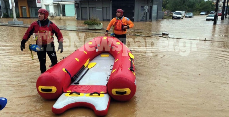 Ακόμα και βάρκες επιστρατεύθηκαν από τις δυνάμεις της Πολιτικής Προστασίας προκειμένου να απεγκλωβιστούν πολίτες και εργαζόμενοι από το κέντρο του Βόλου λόγω της κακοκαιρίας Daniel.