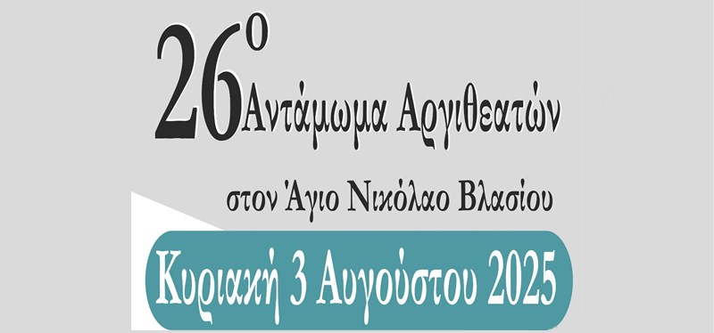 Tο 26ο Παναργιθεάτικο Αντάμωμα διοργανώνει η Πανελλήνια Ομοσπονδία Αργιθεάτικων Συλλόγων σε συνδιοργάνωση με το Δήμο Αργιθέας στις 03 Αυγούστου 2025, στον Άγιο Νικόλαο Βλασίου Αργιθέας,με ώρα έναρξης 11.30.